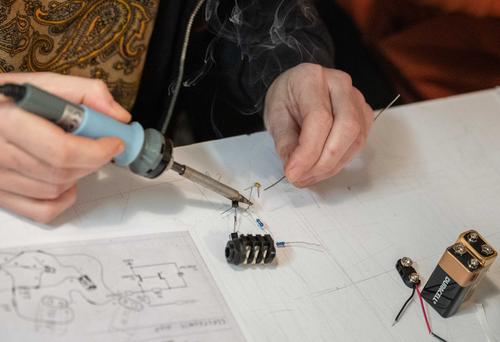 In connection with the installation Derniers Souffles, Sonia Saroya offers a workshop for making different types of electronic circuits, paper synthesizers for children, oscillators for adults, all in a sculptural style.